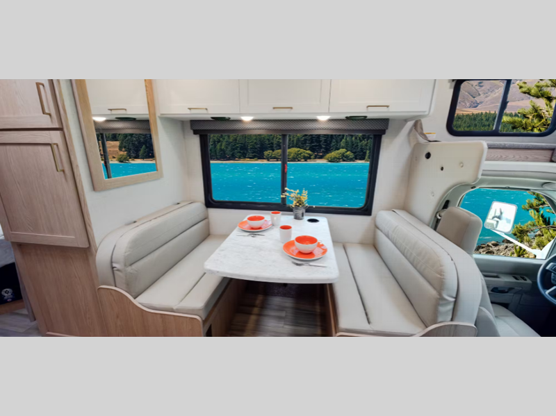 Sleeps 5 Slides 1 Length 24 ft 1 in Ext Width 8 ft 3 in Ext Height 11 ft Int Height 7 ft Interior Color Nantucket Blue ll, Sunlit Silver Exterior Color Standard Graphics Hitch Weight 8000 lbs GVWR 12500 lbs Fresh Water Capacity 40 gals Grey Water Capacity 35 gals Black Water Capacity 30 gals Furnace BTU 19000 btu Generator 4.0 kW Gas Dual Gas/LP Fuel Type Gas Engine 7.3L V8 Chassis Ford E-Series Horsepower 325 hp Fuel Capacity 55 gals Wheelbase 158 in Number Of Bunks 1 Available Beds RV Queen Torque 450 ft-lb Refrigerator Type 12V Convection Cooking Yes Cooktop Burners 2 Shower Size 24" x 36" Number of Awnings 1 LP Tank Capacity 40.9 lbs Water Heater Type Tankless AC BTU 13500 btu Basement Storage 30.9 cu. ft. TV Info Cab 32" Smart TV Awning Info 15' Power w/Integrated LED Lighting Gross Combined Weight 18500 lbs Shower Type Standard Electrical Service 30 amp Similar Floorplans