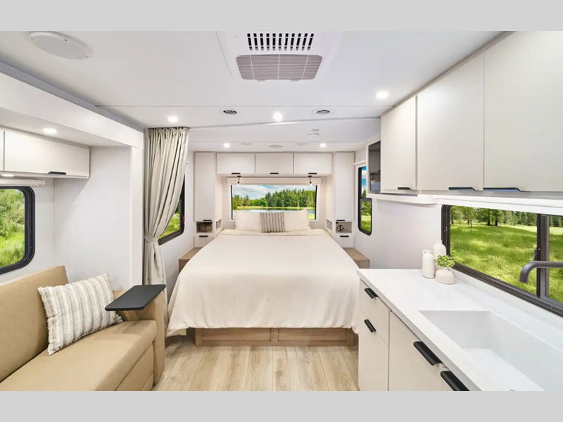 Each Thrive is built with an NXG engineered frame, fiberglass sidewalls with Azdel and a one-piece TPO roof membrane for added durability. There is a power tongue jack and power stabilizer jacks outside for hassle-free set up, and the 200-watt solar panel will provide some off-grid capabilities. Inside, there are many comforts of home including roller shades, residential recessed ceiling lights, versatile sleeping arrangements and more!